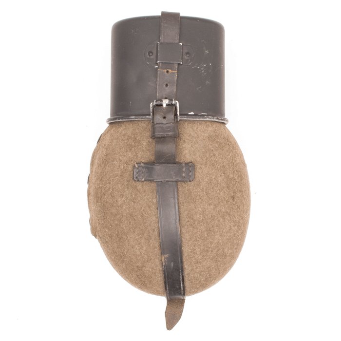 Excellent earlier issue M31 water bottle and cup, black leather strap components, grey painted steel spring clip, felt cover, black painted drinking cup stamped HRE/41, bottle itself dated '39, used but very nice condition, USD $86 SOLD