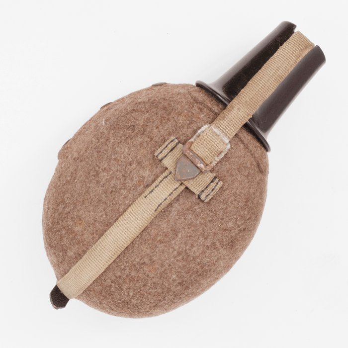Excellent large water bottle and drinking cup, covered water bottle marked ESB42, bakelite drinking cup with maker's logo, webbed fittings, claw buckle, grey metal components show a bit of surface rust, strap's metal tip marked LUX, overall excellent condition, USD $80 SOLD