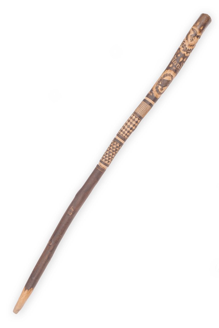Unique Wolchow stock for Fallschirmjäger serving on the Ostfront, elaborately carved hardwood stick measuring a combined 92cm in length, carved motifs include Luftwaffe national emblem over the legend Russland 42/43 and below that a well-defined Luftwaffe Fallschirmjäger qualification badge, below that are additional decorative sections of vertical lines, a checkerboard and a section of triangles, the stick was made to be broken down and is joined at the center with a hollow dowel, the darkened natural wood finished is highlighted by the lighter wood in the carved areas, the tip is pointed, interesting example, USD $850 WITHDRAWN