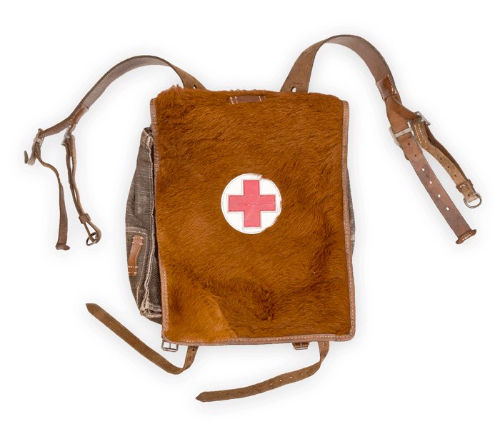 Late war issue medical M34 Tornister, textbook variation finished with blue grey canvas body, brown leathers and alloy fittings, straps and Tornister's body marked with the same WaA office and the maker's stamp - jug 44, typical late war construction with beige and red striped 'Einheit' fabric used for internal lining, some collectors associate this version for use by Fallschirmjäger, Tornister was service used but is complete and undamaged, very nice example, USD $1150 SOLD