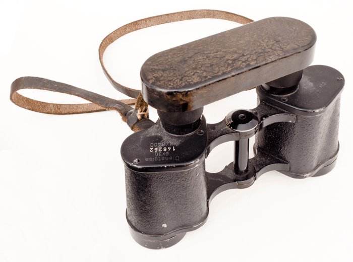 6x30 issue field binoculars, with light service wear, binocular's bakelite fittings and leather strap are without damage, optics are clear, marked with maker ddx, bakelite lens protectors are stamped with Waffenamt, a few small nicks and scratches, a little dusty but will easily clean up, USD $150 SOLD
