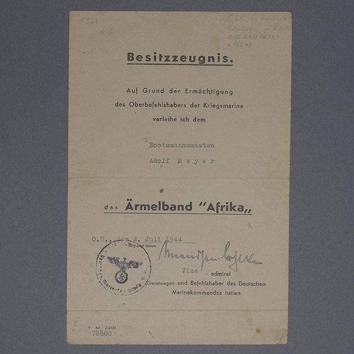 Award document to a Kreigsmarine Bootsmannsmaaten for the Afrika campaign sleeveband, with typed entries, with penciled notations to the upper corners, with facsimile signature of a Vizeadmiral, somewhat age yellowed and has been folded, USD $320 SOLD