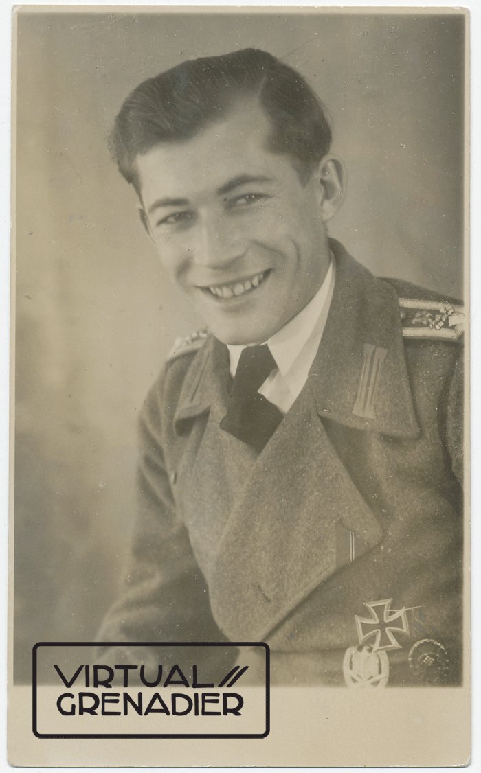 Photo of Heer Panzerjäger NCO wearing field grey wrap with litzen tabs, subject bearer of EKI, general assault and black wound badges, gothic P device and numerals can be seen on shoulder straps, dedication on reverse, 13x8cm, somewhat age yellowed, USD $160, NEW PRICE $60 SOLD