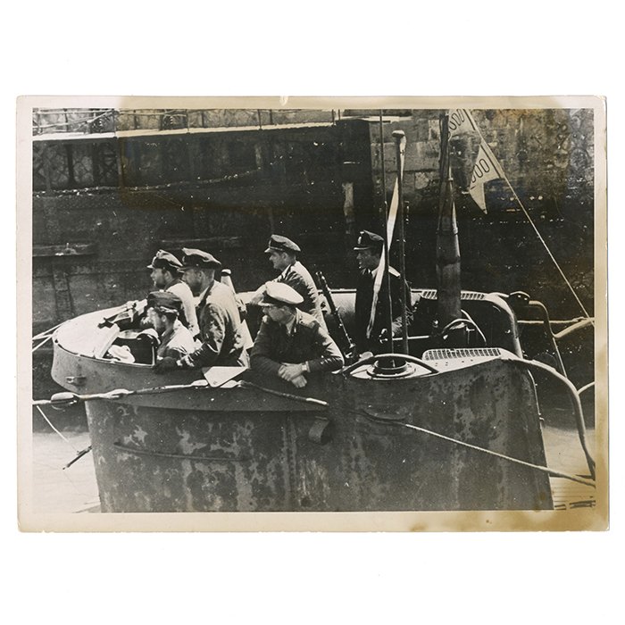 Original press photo, RKT Korvettenkapitän von Forstner and crew returning from patrol, dated 2.7.1943, photo depicts subject with crew in conning tower returing to port, typed caption with ink stampings on reverse, brown stains to the edges, USD $65 SOLD