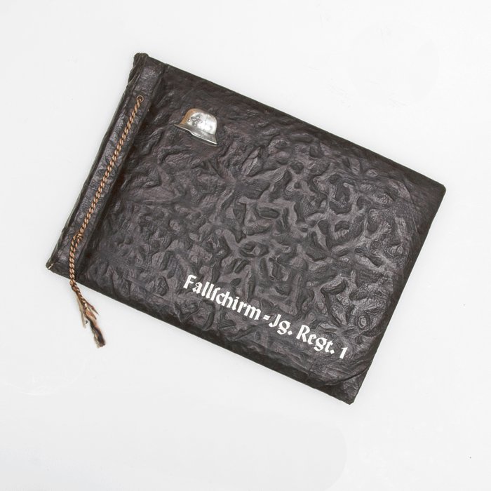 Sensational photo album from a member of Fallschirmjäger Regiment 1, remarkable album belonging formerly to a member of the regiment whose duties also included a lot of flying, subject is seen wearing a flight clasp in addition to hi FJ badge, album is noteworthy for the fact that the subject served in almost every theater of war including Holland, Norway, Crete, Russia and Tunisia, later he was involved in non combat duties in Naples and Bucharest, large format album with metal helmet having Luftwaffe eagle on cover and rare embossing of Fallschirm=Jg.Rgt. 1 in silver to the cover (indicating likely purchase from soldier's canteen at a home base such as Stendal or Gardelegen), well captioned photos depict landing scenes in Holland, destroyed Dutch armor and vehicles, German panzers, Dutch prisoners, graves, harbor and destroyed buildings in Narvik, numerous photos from the air in Ju52s, shots of Belgrade, Salonika, Athens and Roman scenes, photos of massed Ju52s approaching Crete over the Mediterranean, airfields and personnel at Tobruk and Derna, air convoys over Tunis, burial ceremonies, camo scenes, crash landed Stuka, destroyed Russian armor and towns, photos from home leave, there are also quite a few stock photos of places like Belgrade and Naples, over 200 photos in all, from a well known FJ-related collection, USD $1250 SOLD