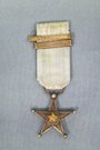 Original era manufacture. 30mm silver star with a tiny gold star at center. Silver bars on the ribbon for service. Normal age and wear.