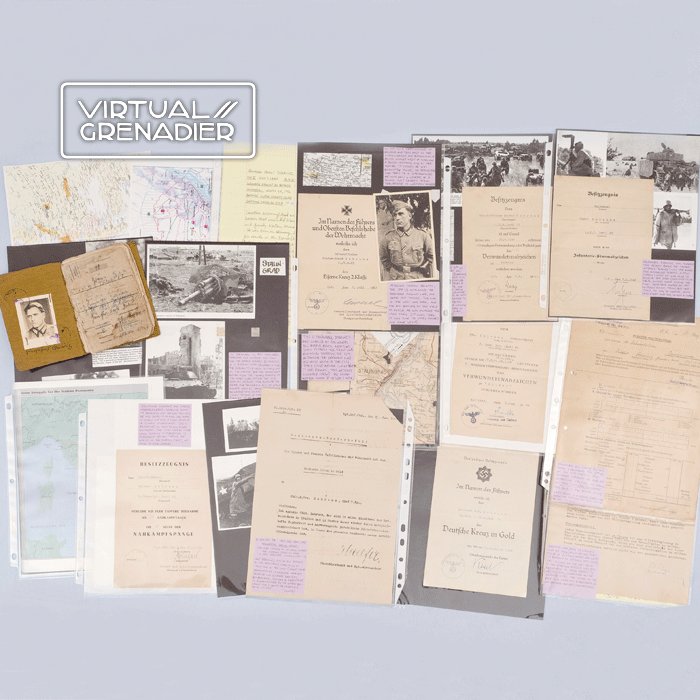 Compelling set for a Heer Infanterie Oberleutnant recipient of German Cross in Gold and Panzervernichtungsabzeichen that saw service on East (Stalingrad), West and Italian fronts, subject served the entire war and fought in almost every major combat while serving with the 3rd Inf. Div. (motorized), this elite unit fought in the early blitzkrieg campaigns in Poland, France, Russia including the areas of Leningrad and Moscow and was destroyed at Stalingrad, subject survived Stalingrad battle by being on leave when Stalingrad was surrounded, he was part of the newly reformed 3rd (mot) Pz. Gr. Div. and went on to fight in Italy (Salerno, Anzio, Cassino) and West Front battles in France and Germany (Metz, Ardennes, Ruhr Pocket), included is the original issue Soldbuch (August '39) with stapled photo that was carried throughout the entire war, Soldbuch is filled out top-to-bottom with numerous promotions, hospitalization and combat awards including Ostmedaille, EKII, EKI, Infantry Assault badge in Bronze, Close Combat Clasp in Bronze, Black and Silver Wound Badges, German Cross in Gold and the rare award for the Single-handed Tank Destruction badge (awarded at Stalingrad), award documents include Wound Badges in Black and Silver, EK2, Bronze Infantry Assault (rare version for motorized troops), Close Combat Clasp in Bronze, German Cross in Gold, also included are original photos of subject as a Senior NOC as well as January '45 photos of subject wearing all awarded medals including Nahkampfspange, German Cross in Gold and Tank Destruction Badge, further included are subject's official notification of the award of the German Cross in Gold, miscellaneous wartime and post-war personnel documents, in addition there is a wartime German army large color issue field map of Stalingrad with subject's notations marked showing the actual front lines, Soldbuch is worn from much use and a few pages are loose but all are present, the entire set is contained in a binder along with photocopies and written background information from a former owner, an excellent combat groupings for an extraordinarily well-decorated soldier, USD $3400 SOLD