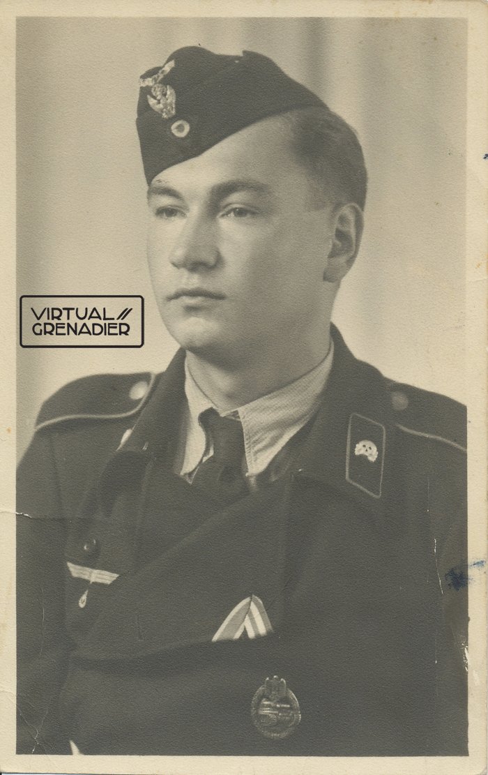 PPS012 Photo of Heer Panzer EM wearing black wrap and overseas cap with Schwedter Adler