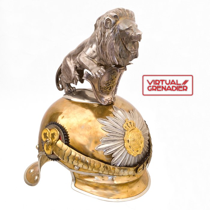 Saxon parade helmet for officer in Garde-Reiter-Regiment Dresden, rare example only lightly worn, with full brown leather sweatband and having a white silk lining, the inner tail is lined in light colored suede leather, the parade lion is fastened with a screw, wingnut and washer, the gold finished helmet body has the silver starburst plate with gold-plated coat of arms, the metal chinscales are attached to a leather chin cord with buckle, gilt covers are applied over both rosettes, the lion holds a gilt metal crowned cypher, entire ensemble is in near excellent condition, this piece is in the hands of a consignor and will be shipped directly from him to the buyer, USD $19,950 SOLD
