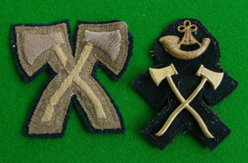 Two sleeve trade badges worn by a soldier in a Light Infantry Regiment. A pair of embroidered crossed axes in khaki on a Rifle Green backing accompanied by a pair of brass crossed axes surmounted by a bugle horn on the same shaped Rifle Green backing. {Cloth backing is Rifle Green although it looks darker in the photos it has reacted to the green background}