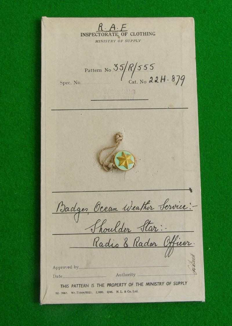 Scarce and unusual pale blue and gilt shoulder star worn by a 'Radio & Radar Officer' in the Ocean Weather Service still affixed to an R.A.F. Inspectorate of Clothing pattern card. Original wax seal to the reverse with manufacturers date for 1958