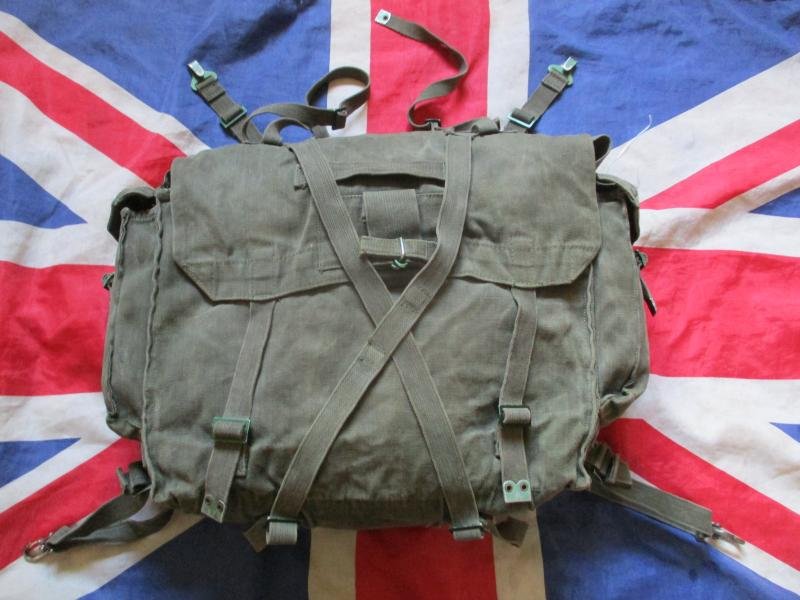 100% GENUINE ISSUE BRITISH ARMY 58 PATTERN WEBBING LARGE PACKA CLASSIC BIT OF KIT , AND ICONIC FALKLANDS WAR WEBBING KITfeatures = 40 LITRE SIZE MAIN BODY , 2 TOP STRAPS TO FIT 58 SLEEPING BAG IN OR ROLL MAT , 2 SIDE POUCHES . FRONT X STRAPS TO CARRY HELMET UNDER IT AND 58 SPADE OR PIK FITTING . 2 TOP C HOOK CLIPS TO FIT ON D RINGS ON 58 WEBBING YOKE AND 2 LOWER 58 SPRING CLIPS TO FIT ON AMMO POUCH LOOPS ...CAN BE FITTED TOGHETHER TO MAKE SHOULDER STRAPSEARLY LIGHT GREEN BRONZE GREEN MEAL FITTINGSCONDITION = NORMAL WORN USED ONE ALL CLIPS N BUCKLES ARE FINE , 2 SMALL FRAYING TYPE WEAR AREAS ON BACK NOTHING MUCH . WORDS IN PEN ON BACK AS WELL .1000% GENUINE ORIGINAL . I THINK PICTURES SAY IT ALL...AS IN THE PICTURES!!!!!!! colour = og green