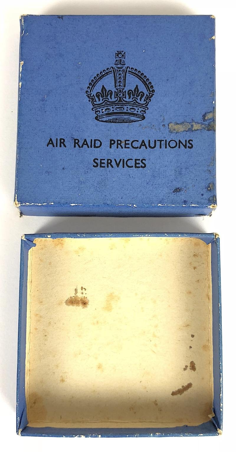 A scarce original wartime period 'Air Raid Precautions Services blue square cardboard box. CONDITION: with three splits to corners on upper half, scuffs, scratches with overall service wear. Colour may vary slightly on photograghs.Size approx 65 x 65mm.