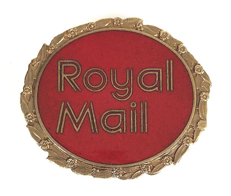 A scarce original circa 1960's period gilt brass oval with floral trim, the centre displaying 'Royal Mail' title on red enamel ground. Very good condition, complete with original pin fittings, no damage to the enamal.Size approx 36 x 31mm.