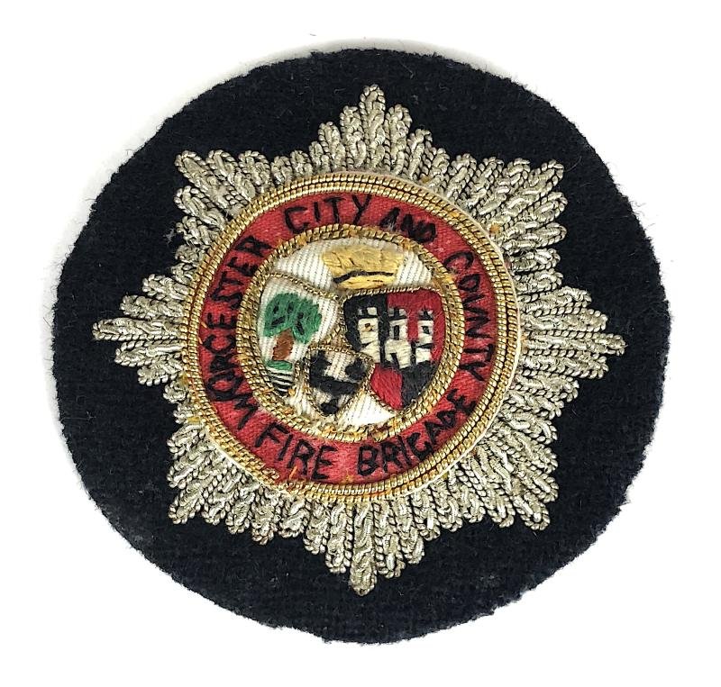 A very scarce original circa 1948 - 1974 period 'Worcester City and County Fire Brigade officer's black felt cap badge'; large padded silver bullion eight pointed star bearing City and County of Worcester coloured embroidered Coat of Arms to centre within black embroidered title on red cloth surround. Very good unused condition.Diameter approx 61mm.