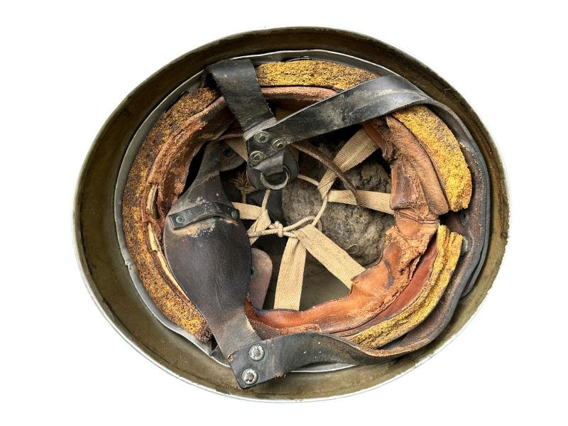 In used condition a British Airborne Paratrooper Helmet which is slightly maker marked 'bmb' and dated '1943' as well the size stamp is visible.The leather chin straps are supple but has a small damage as well the sweatband.Nice example for display.
