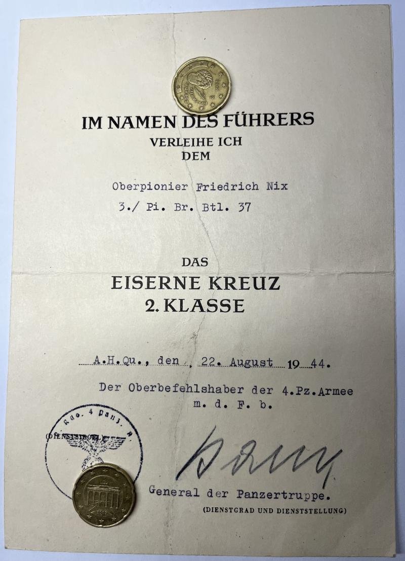 EK II citation of 'Oberpionier' Friedrich Nix who served within Pionier Brucken Btl.37 under command of the 4.Pz.ArmeeThe citation has been signed by 'General der Panzertruppen' Hermann Balck (RK 3-6-1940 ,EL 20-12-1942 ,Schw. 4-3-1943 ,Brill.31-8-1944)!!!!!Although the document has been torn in 2 pieces once and has been restored by glueing it on a backing,a great citation with great signature!