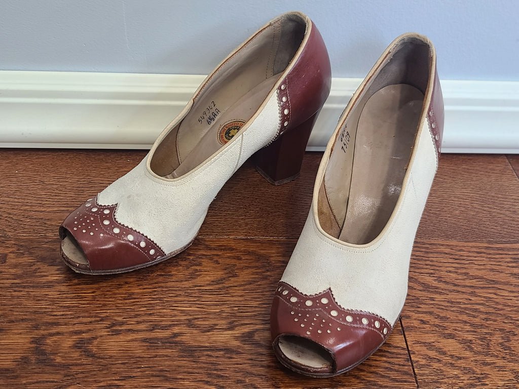 Vintage 1940s brown and white spectator peep toe pumps. The shoes are marked size 6 1/2 AA. Made by The United States Shoe Corp. Gold Cross Shoe. Overall fairly good condition. They have been worn, but still have plenty of life left. Measured inside, the length is 9 1/2' and the ball of the foot is about 2 1/2' across.