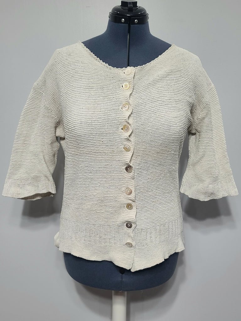 Vintage 1930s German off-white short sleeve sweater.MEASUREMENTS (approximate):Bust- 44'Waist- 38'Length- 24'Sleeve(shoulder seam to end) - 12 3/4'When I first got this, it had some brown storage wear staining. I soaked it (in cold water) and most of the stains came out, however, the sweater seems to have stretched out. The sleeves are somewhere between short sleeve and 3/4 length. The way it buttons is sort of wavy. You can see the weave of the fabric is tighter in some spots and looser in others. There is still a few light stains (mostly along the collar and on the sleeves). The top button is replaced. The other buttons are mother of pearl, so the color varies on them.