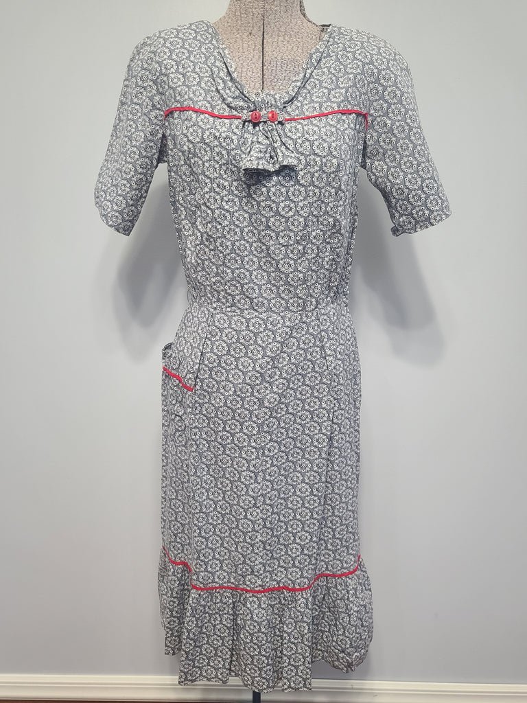 Vintage 1940s gray/blue print dress with red trim.MEASUREMENTS (approximate):Bust- 36'Waist- 27'Hips- 35'Length- 43'May be handmade. Sailor style decorative 'knot' in the front. Side metal zipper. One pocket. Ruffle by the hem. Missing the belt. Fairly good condition with some flaws. There is general fading/ discoloration along the shoulders and the collar area. One small hole on one shoulder. There is a rather large hem so it could be lengthened or the material used to make a belt.