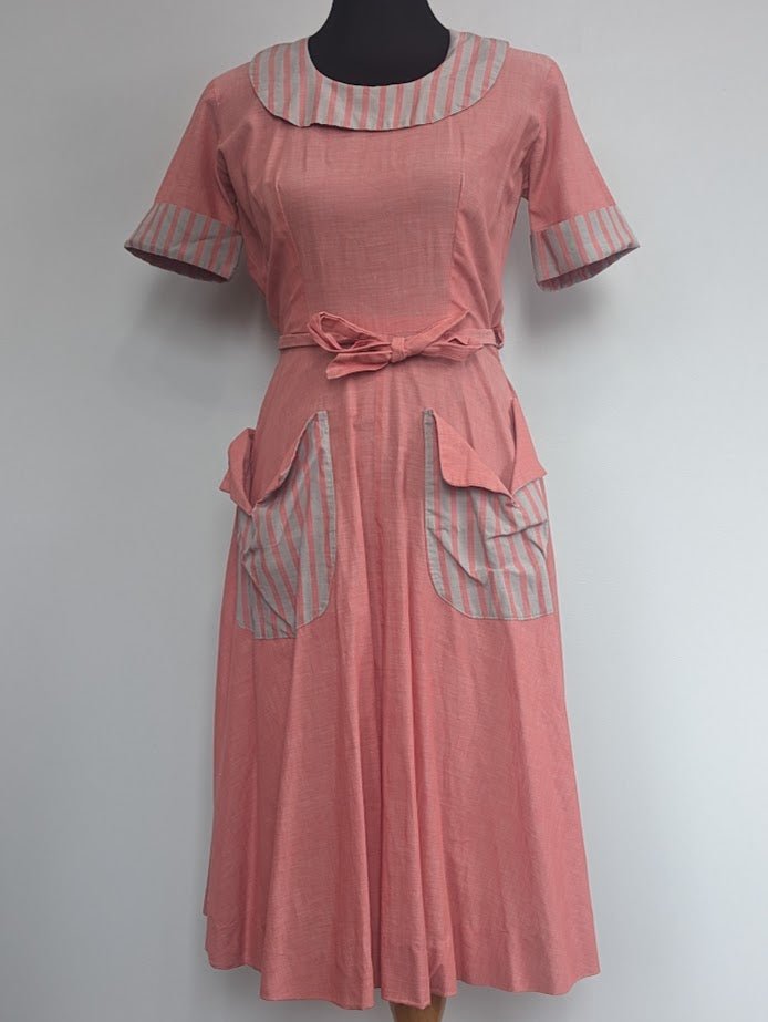 Vintage 1950s pink wrap dress.MEASUREMENTS (approximate):Bust-39'Waist- 26'-30'*Hips- 38'Length- 43'*Since it is a wrap dress, the size is adjustable. The mannequin is about a 26' waist. I think 30' waist is the largest it could fit without there being too much of a gap in the fabric when you move. Probably 26'-28' waist is best.Dusty pink dress with gray and pink stripe trim. Nice pockets. Button at the back of the neck. Styled by Jay Ann label.There are several repairs. There is a split on the seam at the side - I assume it is for the belt to go through (as it does in the photos), but the edges seem unfinished. A few yellow specks and some brown spots. Light staining under the arms. Some pulls in the material and scattered small holes. Still wearable.