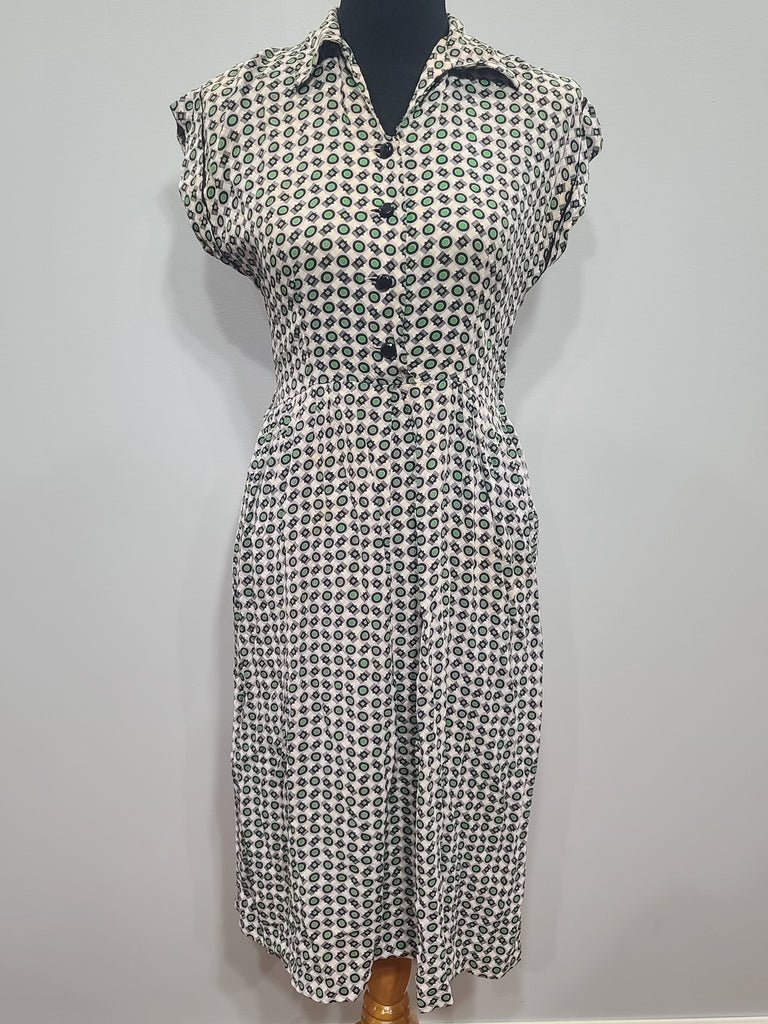 Vintage 1940s green print rayon dress (as-is).MEASUREMENTS (approximate):Bust- 33'Waist- 27'Hips- 37'Length- 41'Black buttons down the front. Side metal zipper. AS-IS condition with flaws. A lot of staining throughout. Fraying on the color. Hole underneath one button. Small holes under one arm. Some pulling at the seams. Belt loops, but no belt. No attempt has been made to launder this dress.