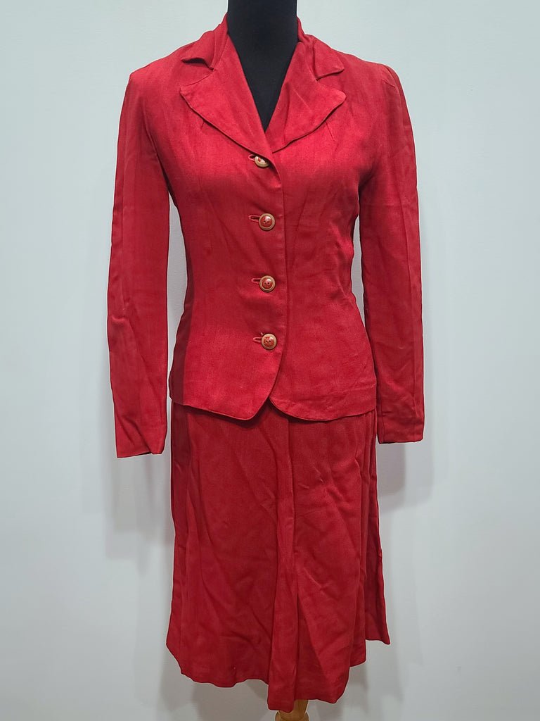 Vintage 1940s red skirt suit outfit.MEASUREMENTS (approximate):JACKET:Bust- 35'Waist- 29'Length- 23 1/2'Sleeve(shoulder seam to end of cuff) - 24'SKIRT:Waist- 25 3/4' (verytight 26')Hips- 36'Length- 25 1/4'Nice bright red color. Looks to be handmade. Wooden buttons (some of the paint has chipped off). I am not sure the material - it feels a bit softer than standard wool; possibly a blend? The jacket is lined. The skirt has an interesting early plastic red Talon zipper.AS-IS with flaws.It has some staining and discoloration throughout. No attempt has been made to launder it. Under the arms, there is staining. On the shoulders and down the sleeves there is some dark discoloration (probably from improper storage). The discoloration was a bit hard to photograph, but it is there. Small hole by the bottom button. Several tiny pinprick holes. The inside lining is stained (especially under the arms) and has some loose stitching. Skirt waist band has some staining.