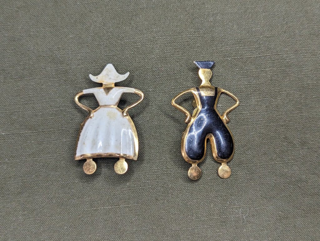Vintage 1940s dancing man and woman pin set. They look to be in traditional dress. Decent condition. Some discoloration on the woman.