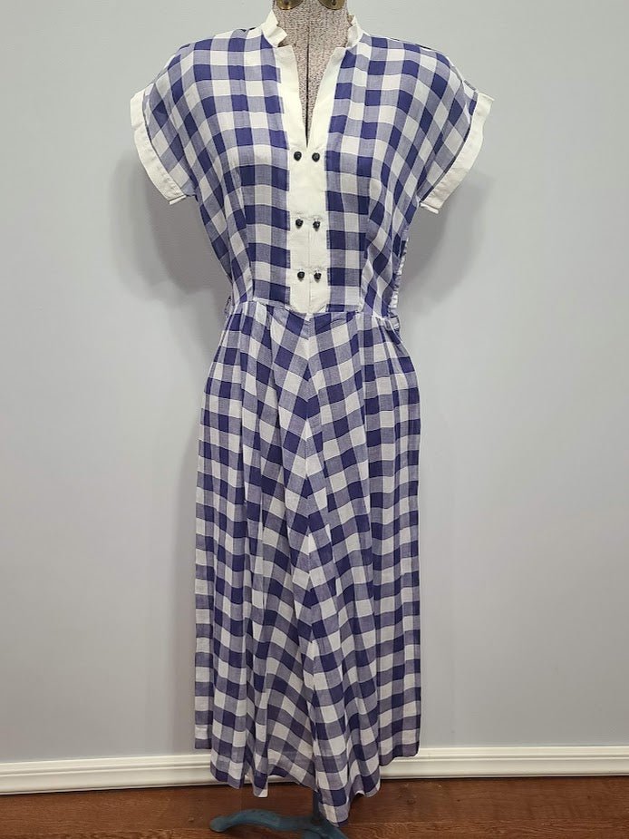 Vintage 1940s blue and white plaid dress.MEASUREMENTS (approximate):Bust- 36'Waist- 27'Hips- 39'Length- 46'The dress is fairly see through, so a slip must be worn underneath. Side metal zipper. There are a few small holes - two on the skirt and one on the back. There are some split seams. Some light discoloration on the back and on the shoulders. The white trim also has some light staining. The dress has not been laundered.