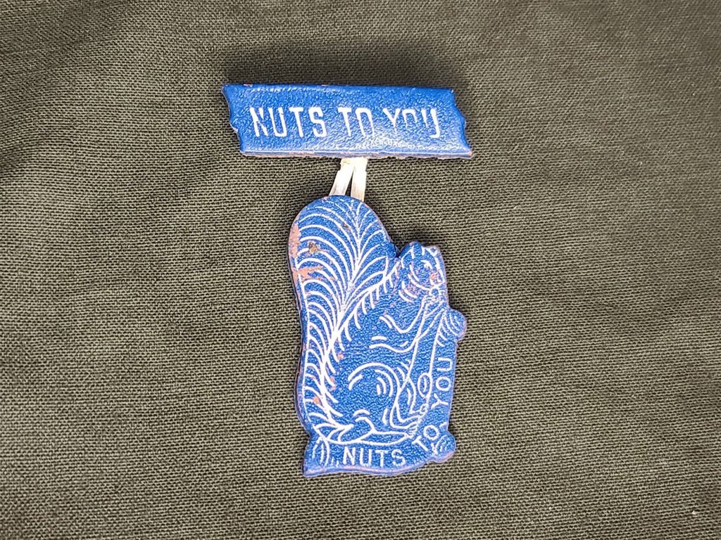 Vintage 1940s fun novelty leather pin. The top portion says 'Nuts to You' with a dangling piece of a squirrel. There is some wear on the leather and it seems a bit fragile to wear. The pin on the back is a bit rusty. The pin is marked 'Pat. Pend'.