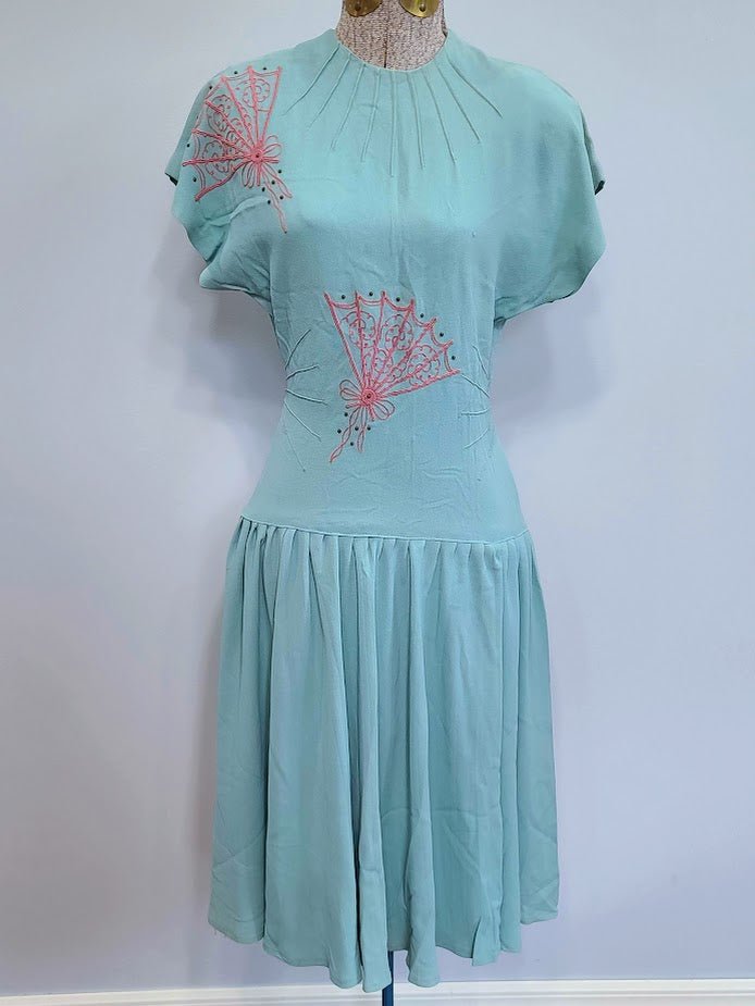 Vintage 1930s / 1940s robin's egg blue dress with pink fan design.MEASUREMENTS (approximate):Bust- 33'Waist- 24'Hips- 32'Length- 41'Cute rayon dress. The photos do not show the true color - it is a robin's egg blue / teal color (I added a color swatch that shows a more representative color). Penny Mason label. Dropwaist style dress. It does have some flaws. Stitching at the neck and sides give it a flattering look. Metal back zipper. There are several light stains throughout. No attempt has been made to launder it. A few pulls in the material and some loose stitching. Still in decent, wearable condition.