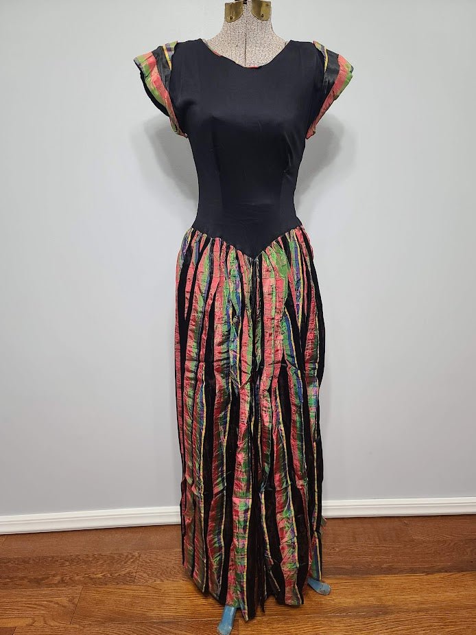 Vintage 1940s gown with colorful skirt and sleeves.MEASUREMENTS (approximate):Bust- 30'Waist- 22'Hips- fullLength- 56 1/2'Lovely colorful shiny iridescent material on the skirt. Overall, fairly good condition but there are a few issues. There is a small hole (maybe cigarette burn?) on the skirt, but the material is so full that it is kind of hidden. A few split seams and loose stitches. Hook and eye closures on the side. The shoulder area has been taken up (perhaps she felt that the neckline was too revealing?) - I took a photo of the inside stitching; I believe all the material is still there to let it back down. This would be a great dress to wear to a dance!