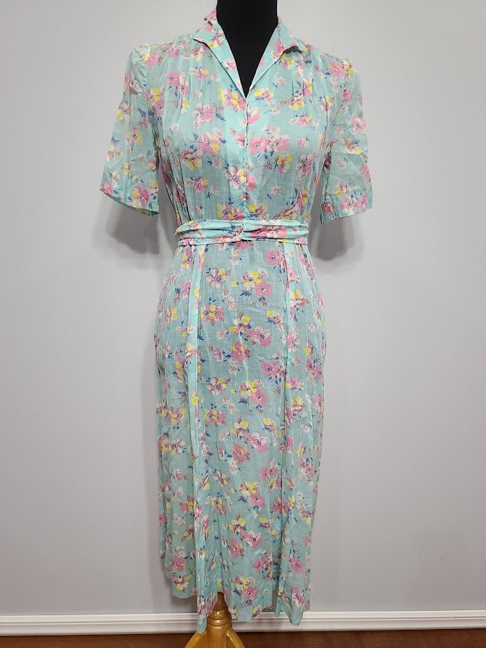 Vintage 1930s / 1940s light blue floral print dress.MEASUREMENTS (approximate):Bust- 35 1/2'Waist- 31'Hips- 41'Length- 44'This dress appears to be handmade. It has a separate belt (no belt loops). The front closes with snaps and there is a metal side zipper. The dress is somewhat see-through, so a slip must be worn underneath. Overall fairly good condition. Some loose seams under the arms and a small light colored stain (not too noticeable).