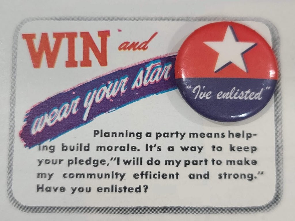 Reproduction 'I've Enlisted' pinback button. This pin is featured on the cover of McCall's of February 1942 (magazinenotincluded). You would sign the attached pledge to do your part to help win the war and mail it in to receive the button. Slight color variation.More repro pinback buttons available here.