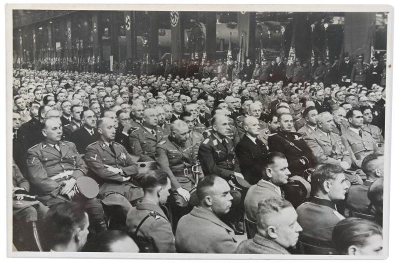 In a very good condition a stunning picture of Rudolf Hess and other political members etc.Rudolf Hess (at the right) at the conference of the Reich Chamber of Labor in the factory of Messerschmitt AG Haunstetten / Augsburg, and names the companies honored by Hitler, to which they awarded the title of 'National Socialist Model of Industry'. In the background, flags of the German Labor Front (DAF).The picture comes in a postcard size of 10x15cm.