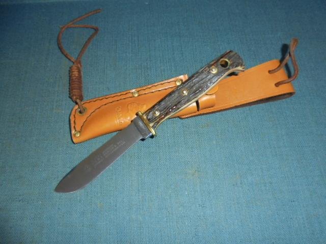 This is a great working knife with a 4' blade etched logo 11 6397 HANDMADE PUMA HUNTER'S PAL GERMANY HIGH CARBON STEEL on one side and a Rockwell stamp on the otherThe knife is 8' overall with a small brass guard stamped 24091 and a stag horn grip, and it has its original sheath S/n 03027Price includes UK delivery