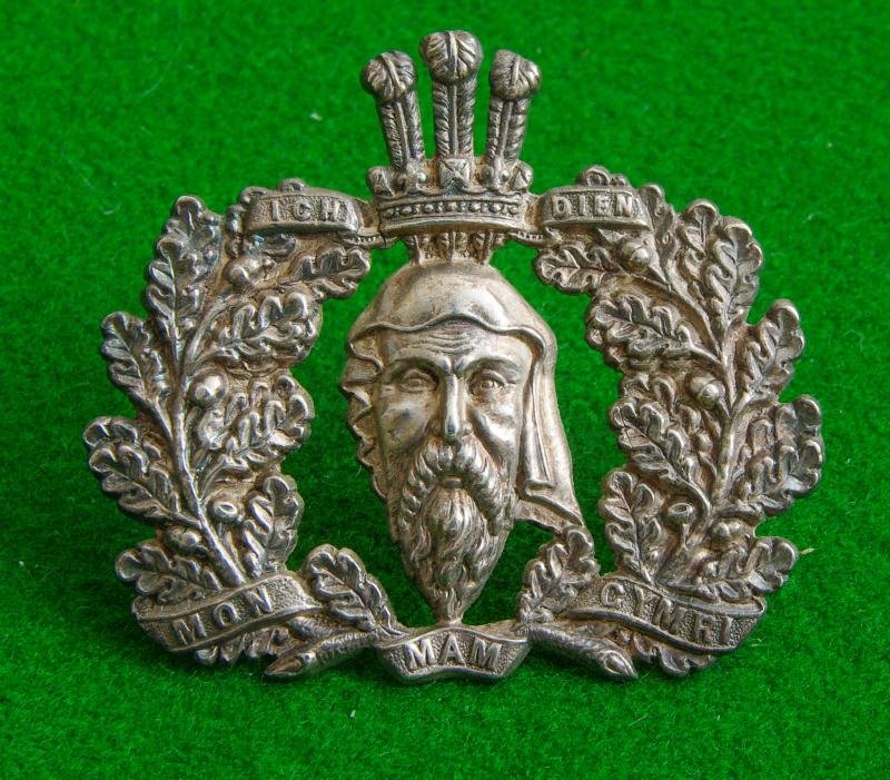 Rare officers silvered headdress badge with two black loops to the reverse. The head of St. David to the centre of a wreath of oak bearing the motto scroll, ' Mon Mam Cymri ' surmounted by the Prince of Wales's plumes. {Formed in 1877}