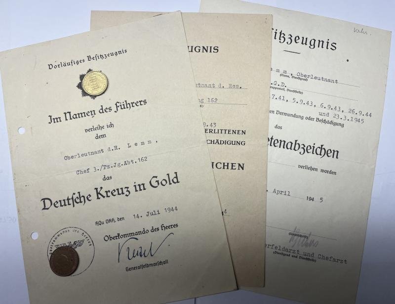 Citation grouping of 'Oberleutnant' Willi Lemm who served within Panzerjäger Abt.162 o the 62.Inf.Div.1) SWB citation which has been issued at Oppeln and which has been signed by 'Major' and unit commander?2) Preliminary 'DKiG' citation of Lemm who acted as 'Chef' (commander) of 3/Pz.Jag.Abt.162 by then.The citation bears the printed signature of 'GFM' Wilhelm Keitel3) GWB citation which has been issued at Reserve Lazarett LüdenscheidLemm served by then within Stab 272 V.G.D.