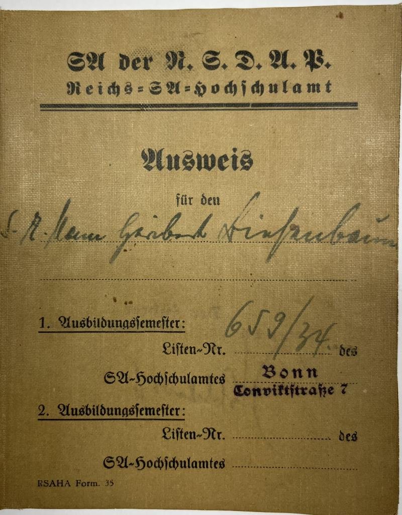SA - NSDAP I.D of 'SA-Mann' Heribert Biezenbaum who served within SA-Hochschul-Amtes in Bonn
