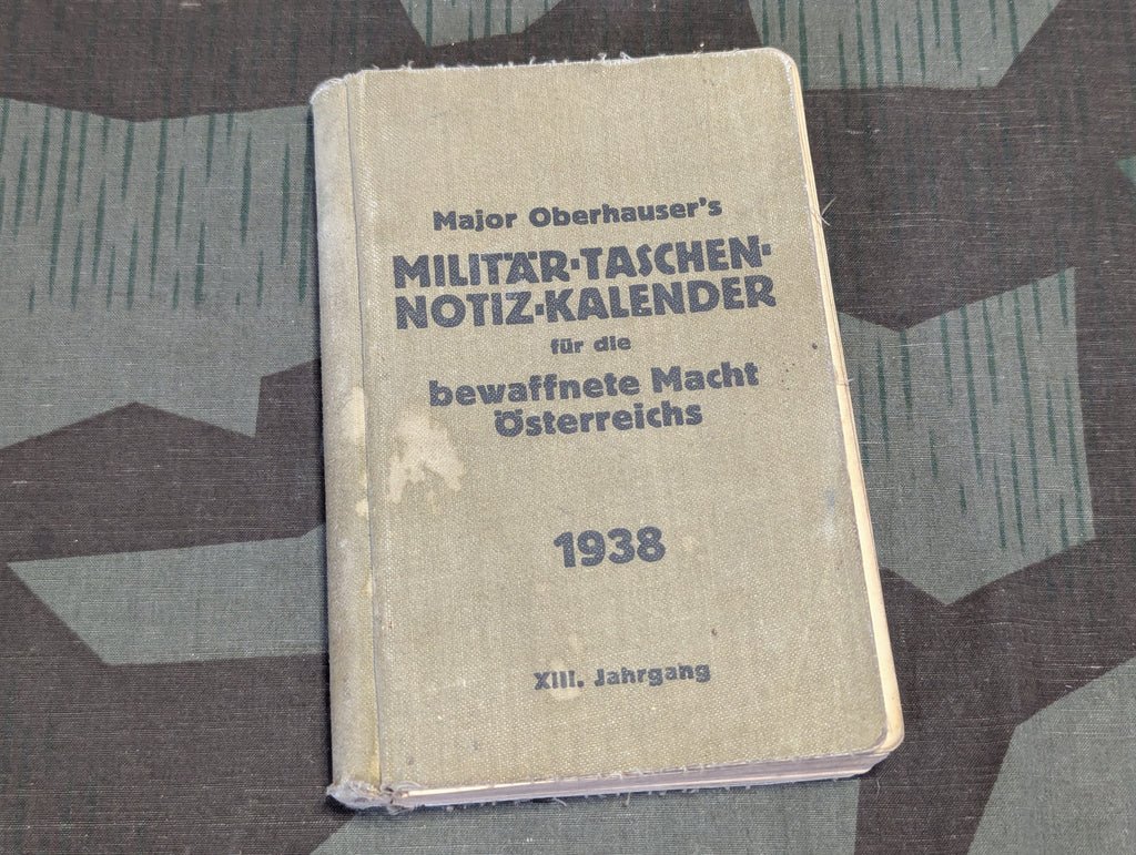 Original 1938 Austrian military pocket calendar book. The condition is a little rough, but it seems to be complete. The spine is decaying. This in one of the more detailed pocket calendars I have found, almost a mash up of a training manual and a pocket note book planner. The spine has a cardboard tube which is presumably a pencil holder. They really tried to cram as much functionality as they could into this book. Although the actual calendar portion is probably the least useful version I have seen. It is named but I did not find any notes. Interesting and probably fairly rare, as Austria was integrated into the Reich only 3 months into 1938, so this book didn't see much use.