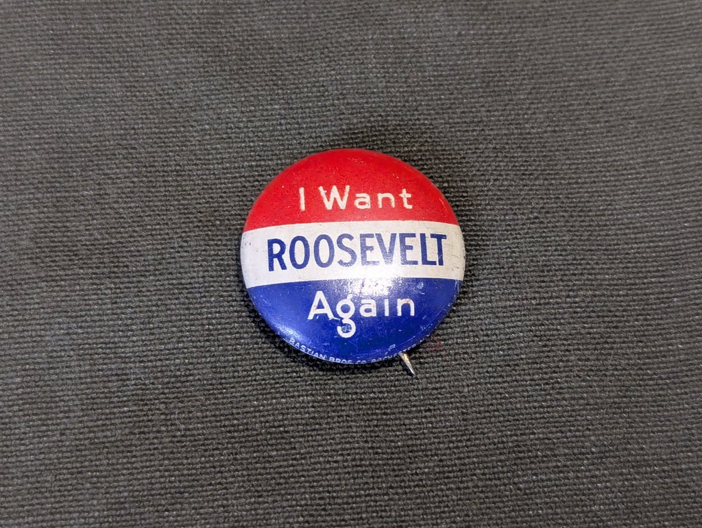 Original small ' I Want Roosevelt Again' political buttons. These are small.The price is for ONE randomly selected pin. All are in decent condition. Some are faded and some have a few light scratches / chips in the paint. Made by Bastian Bros. Co. Rochester, N.Y.