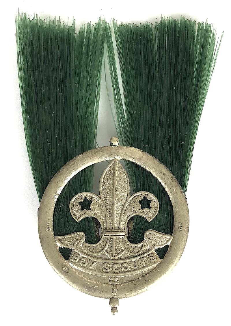 A scarce original circa 1937-1952 third pattern 'Scoutmaster Officer's hat badge', Electro Plated Nickel Silver arrowhead in circlet bearing 'Boy Scouts' motto scroll below; the reverse impressed 'E.P.N.S' within semi circle holder. Good condition, some service wear, complete with green nylon plume, correct amount of bobbles top and bottom and two flat loop fittings with split pin.Diameter approx 31mm.