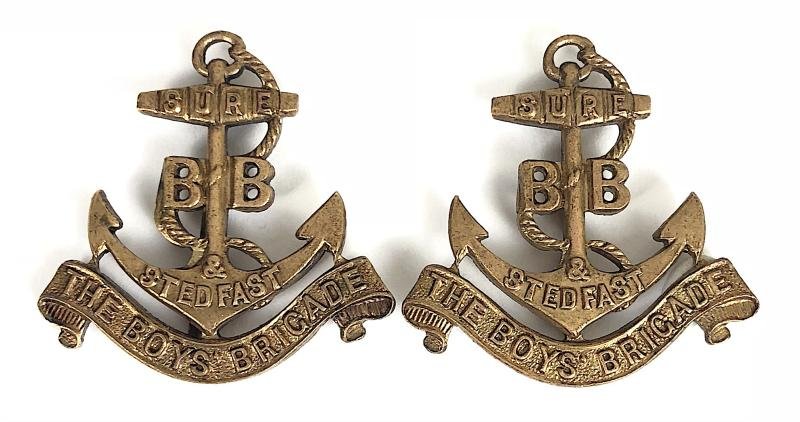 A rare original pre-union 1916 to 1926 period 'Boys Brigade Officers matching pair of bronze collar badges'. Very good condition, both complete with original single pin fittings, good patina.Height approx 35mm.