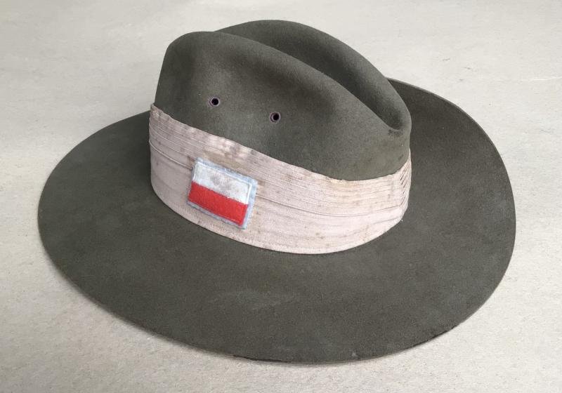 A very nice example dated 1943.Army khaki fur felt with press stud side. Six fold khaki cotton Puggaree with 2/8th Infantry Battalion colour patch. Full size rising sun hat badge fitted to the side brim. Brown leather sweat band factory code maker marked and dated 1943.Really just a perfect slouch hat!