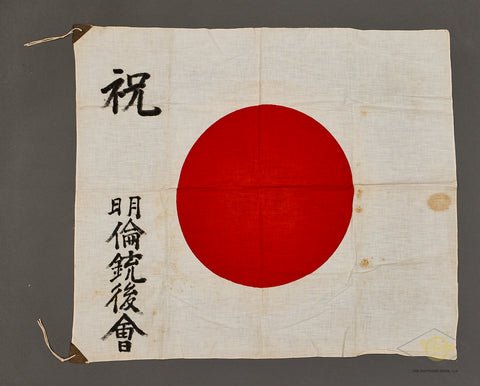 Japanese WWII National Flag-This is a great example of Hinomaru National Flag, also known by many as the 'meatball' flag. This one is very nice. It is quite clean and is a good display size. It measures approx. 31' (79cm) wide by 26' (66cm) tall. This is produced in an off-white soft bunting with a red sun or 'meatball' printed in the center, this produces a mirror image on the reverse. This has one line of kanji in black ink written across the top. This ink has bled through and is visible on the reverse. This flag has brown leather reinforced corners with two white silk ties. This flag shows some very slight staining, but this is not a huge distraction. Please check photos just in case. This is a nice looking flag. We have not translated the kanji so hesitate to call this a good luck flag.It has a great look to it!