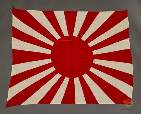 Japanese WWII Army Rising Sun Flag-This is a gorgeous flag. Not only is it very clean, but the colors are also still vivid, including the white. The white doesn't have a spot of age toning to it. This is made of lightweight linen-like bunting.This gorgeous red and white flag measures approximately 50 inches (127cm) long x 40 inches (101.6cm) wide. There is a thin jute like lanyard that runs through the reinforced hoist end. One end is in a small loop.Except for one spot of discoloration, this is choice. The sun is centered on this example, so this flag would have been used by the Japanese army. Remember if the sun is positioned toward the hoist end, it's a navy flag. If the sun is centered, it's for the army. This is a near excellent example, in a rare size.