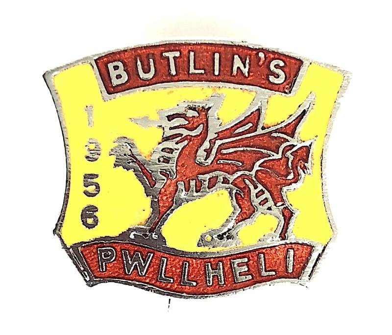 A scarce original 'Butlin's 1956 Pwllheli chromium plated badge' with red enamel dragon and labels on yellow background, the reverse with irish maker's details 'Jewellery Co Dublin Empire'. Very good condition, complete with original pin fittings, no damage to the enamel.Height approx 21mm.