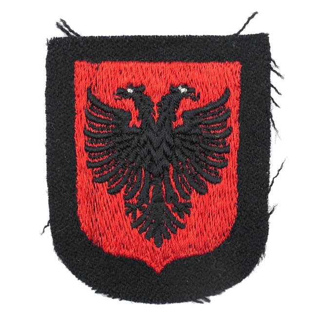 Waffen-SS Albanian 'Skanderberg' Volunteer Sleeve Shield. Albanian nationals were authorized the wear of an identifying sleeve shield to be worn just below the SS eagle on the upper left sleeve of the uniform. Worn by soldiers of the '21.Waffen-Gebirgs-Division der SS (or 'Albanische Nr.1')'. This type was introduced in late 1944 for use by the Albanian volunteers. This shield originates almost certainly from the SS clothing department at the Dachau KZ when liberated in 1945. The shield is in mint and unissued condition and just shows some minor traces caused by years of storage. Nice original sleeve shield!