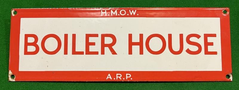 305mm x 100mm enamel sign produced by H.M.O.W., His Majesty's Office of Works, indicating aspects of government buildings that needed to be highlighted for ARP purposes, in this case the ' Boiler House '. In excellent, clean condition with some minor damage to affixing holes.