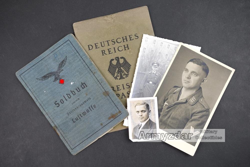 This is a hard used but complete Luftwaffe Soldbuch. The soldier served as a radi operator. He has got the Solbuch in 1941 and used it untill 1945. Including are also pictures and passport.